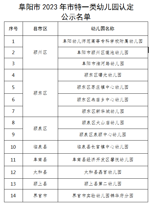 根据《阜阳市幼儿园等级认定评估办法(试行)》(阜教基〔2023〕4号)规定,经幼儿园申报、县市区审核、市级评估,拟认定阜阳幼儿师范高等专科学校附属幼儿园等14所幼儿园为阜阳市特一类幼儿园,现将认定名单予以公示(详见附件)。