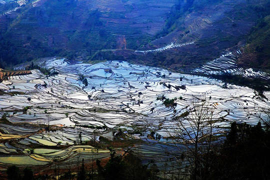 梯田的美离不开水的衬托,元阳梯田每年12月灌水,到了第二年1月正是最漂亮的时候,这期间田地里没有稻子,平平整整的梯田极有层次感,在阳光的照射下更是层层透亮,不需要特别的时机就能遇到很棒的光影效果。