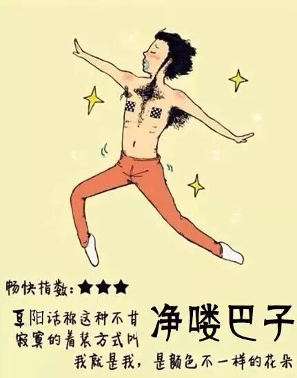 解释:不穿上衣,完全属于漏天状态 举例:天一热你就净喽巴子,怎么就不嫌丑的呢?