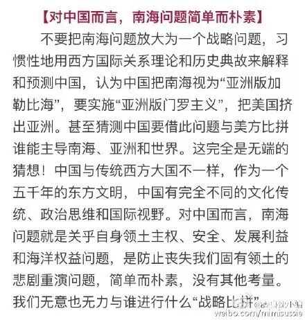 彭博社称,美方把自己定位为这片水域的警察。如果中国采 取强硬回应,将令美国陷入困难境地。美国防长卡特6月曾表示,若中方在黄岩岛实施建设,美方将采取行动。不过美方此前在世界其他一些地区并没有对所谓“越 过红线的行动”采取足够回应,毕竟美方在远离本国海岸线数千英里的地方打起来并不符合自己的利益。《纽约时报》称,美国作为本地区主导性的军事大国,可能 利用仲裁决定来证明其更多的海军巡逻是正当的,争取新的盟友,给老盟友更多支援,并争取世界舆论反对北京的行为。