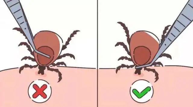 若有蜱虫已钻咬入皮肤,不要生拉硬拽,以免拽伤皮肤或将蜱的头部留在皮肤内。可用酒精涂在蜱虫身上,使蜱虫头部放松或死亡,再用尖头镊子取下蜱虫(镊子尖尽量靠近皮肤,然后紧紧夹住蜱头部或靠近头部的地方,垂直向上缓慢用力,不要扭转或猛拉),使其头部自行慢慢退出,然后用碘酒或酒精局部消毒处理伤口,建议及时前往正规医疗机构由专业人员进行处理